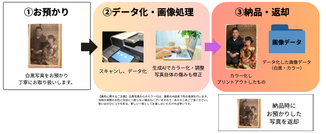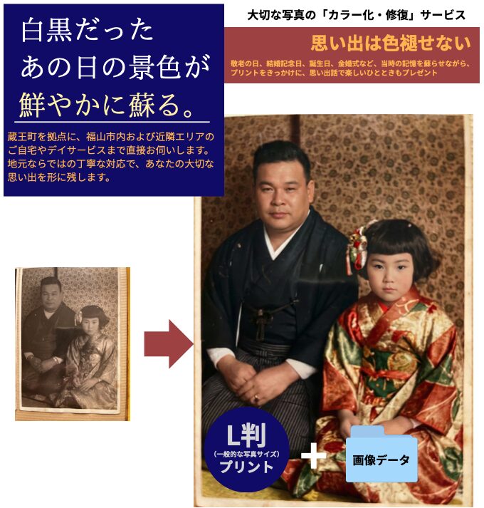 - 内容:白黒写真のカラー化、簡単な傷直し、L判プリント+画像データお届け